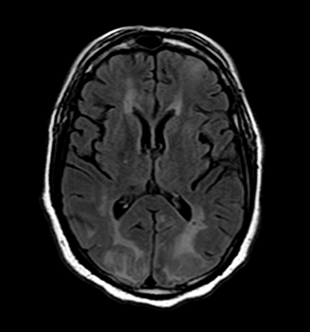 • MRI of the brain reveals symmetric demyelination in the parieto-occipital white matter.